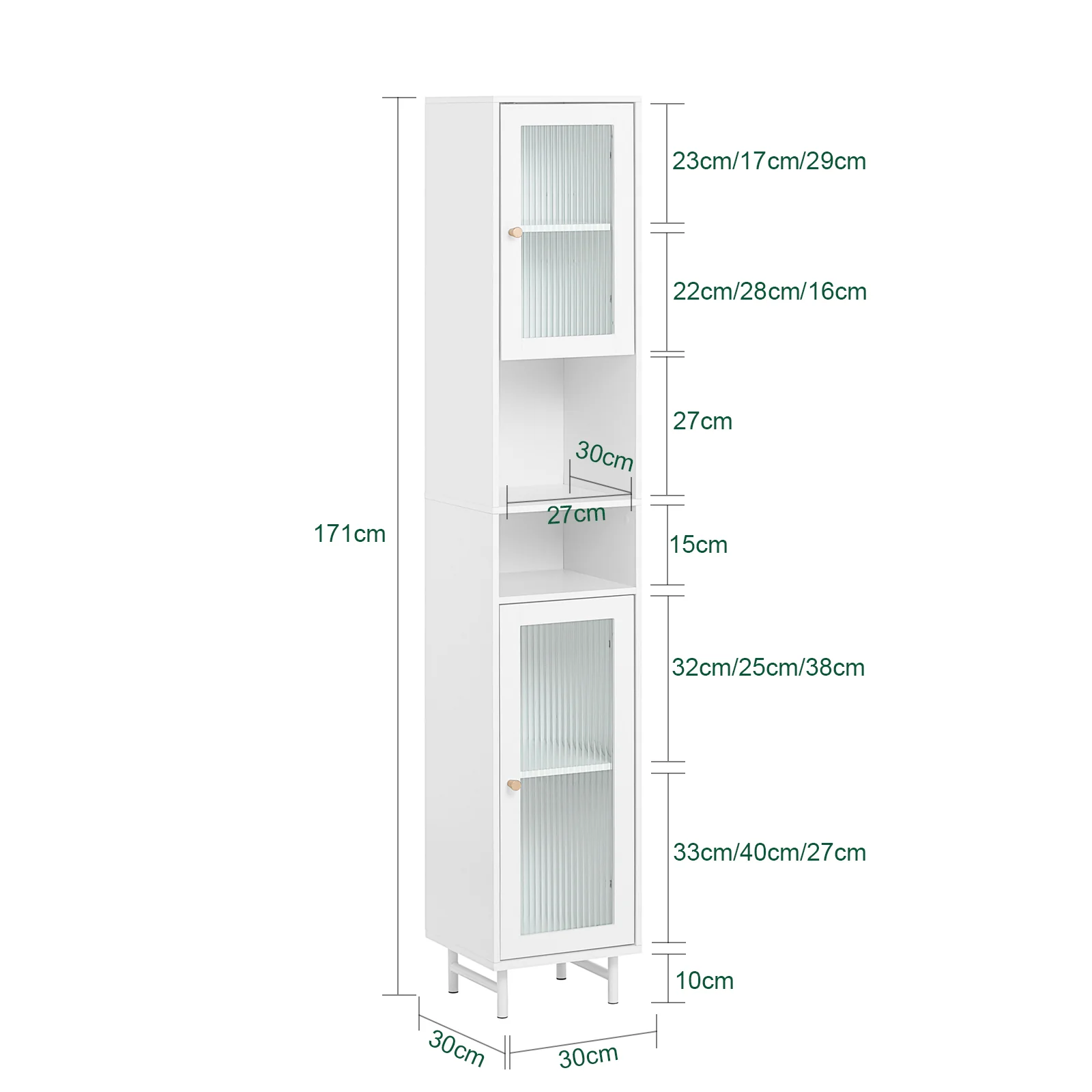 - Medidas de la estructura (L, P, H): 30 x 30 x 171 cm. Con una profundidad de 30 cm y un ancho de 30 cm, este mueble columna encaja perfectamente en espacios estrechos, ahorra espacio y optimiza el espacio.