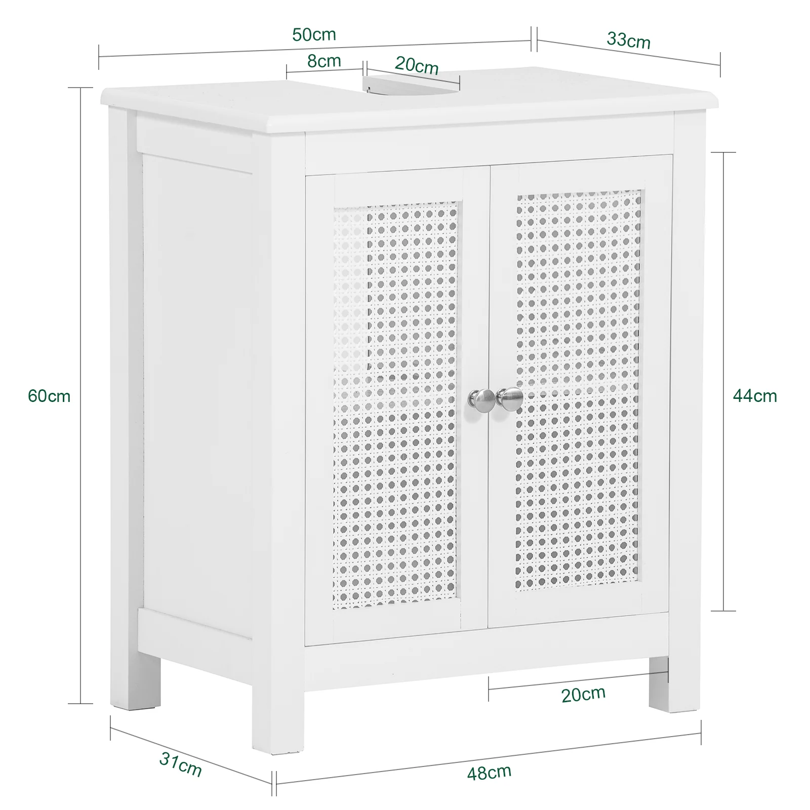 - Material: MDF (E1) lacado en blanco y PVC. Capacidad máxima: 30 kg. Dimensiones: 50 x 33 x 60 cm. Dimensiones para la apertura del sifón: L8cmxP20cm.