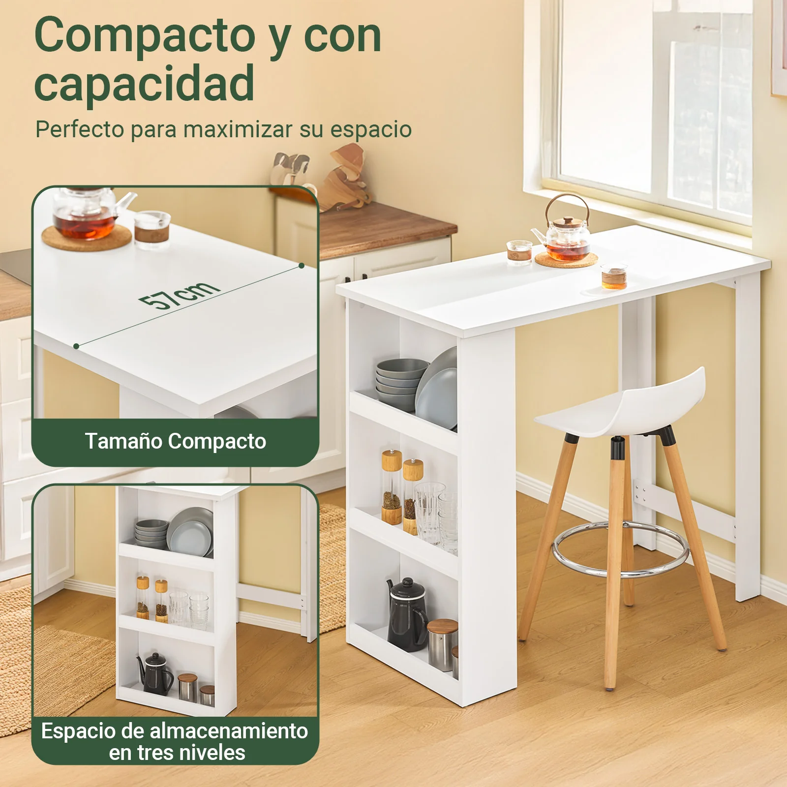- [ALMACENAMIENTO GENEROSO] Con tres estantes amplios, esta mesa ayuda a mantener organizados platos, cristalería y otros esenciales de cocina. Ya sea como mesa de desayuno, mesa de bar alta, o para reuniones pequeñas, ofrece un espacio elegante y funcional para servir bebidas y comidas