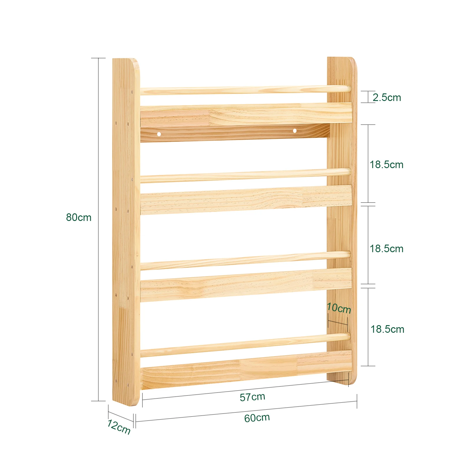 - [Información del producto]: Peso: aprox. 4,5 kg. Capacidad de carga: 5 kg/balda. Material: Pino. Dimensiones del producto: A60 x P12 x A80 cm (ver imagen); Entrega: en 1 paquete; Dimensiones del embalaje: 88x31x12 cm